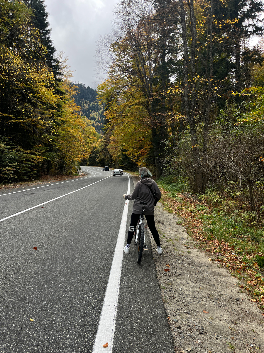 От Теберды до въезда в заповедную зону ехать 13 км. Сильных подъемов и спусков не было. Долетели с ветерком. Потрясающие виды, свежий воздух, трасса широкая - не переживаешь, что машина зацепит. Одно удовольствие. Далее подъезжаем ко въезду в заповедник. Там стоит домик, в котором ведется запись всех вошедших. Въезд стоит 200 рублей с человека, но с нас, решившихся преодолеть этот путь на велосипедах, денег не взяли. Просто пожелали удачи и предупредили, что просто не будет. Спойлер - так сложно мне еще никогда не было. Ехать 12 км. Крутой подъем начинается сразу. До первого более-менее ровного места (совсем равнин нет на всем протяжении) не более километра,