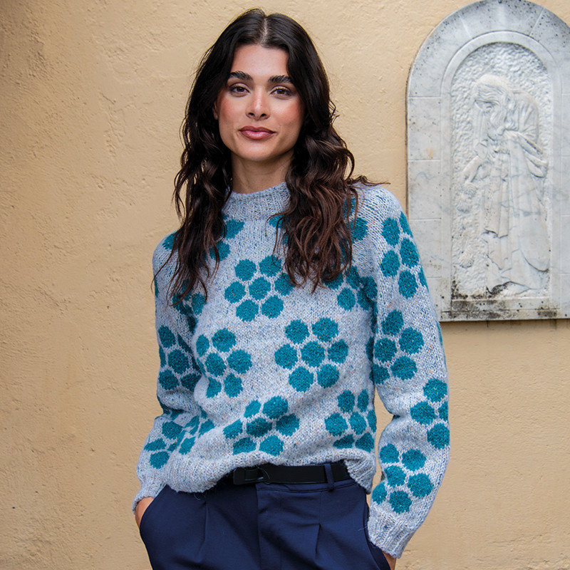 Пуловер, яркие жаккардовые цветы на котором раскрываются во всем великолепии на серо-бежевом фоне