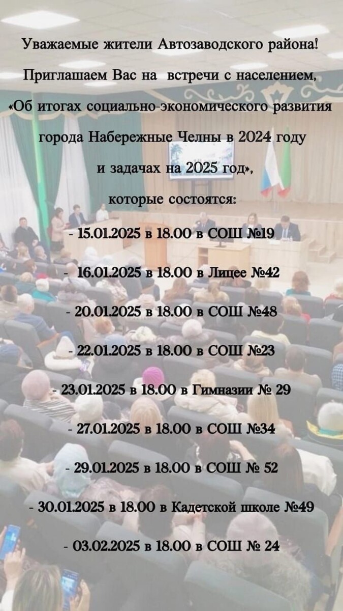 В Набережных Челнах стартуют традиционные встречи с населением, на которых предоставляются отчеты за прошедший год и намечаются мероприятия в 2025-м году. Они проходят в школах в вечернее время на протяжении месяца. Перед челнинцами отчитываются главы районов и другие ответственные лица. Публикуем график встреч, которые пройдут в Автозаводском районе. 15.01 – школа №19 (30/20) 16.01 – лицей №42 (улица Аделя Кутуя, 9) 20.01 – школа №48 (54/23) 22.01 – школа №23 (47/09) 23.01 – гимназия №29 (27/21) 27.01 – школа №34 (49/04) 29.01 – школа №52 (52/36) 30.01 – кадетская школа №49 (50/16) 3.02 – школа №24 (20/08) Встречи начинаются в 18 часов. Ранее публиковались графики встреч с населением Комсомольского района и Центрального района.