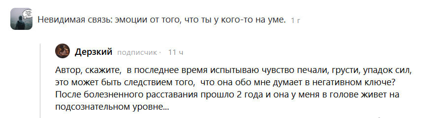После болезненного расставания прошло время, но воспоминания о ней всё ещё живут внутри вас. Это естественно, так как вы не до конца проработали этот опыт. Мало вероятно, что такие ваши чувства вызваны реальными мыслями или эмоциями вашей "бывшей", а что более вероятно, что это вызвано вашими собственными нерешёнными переживаниями.