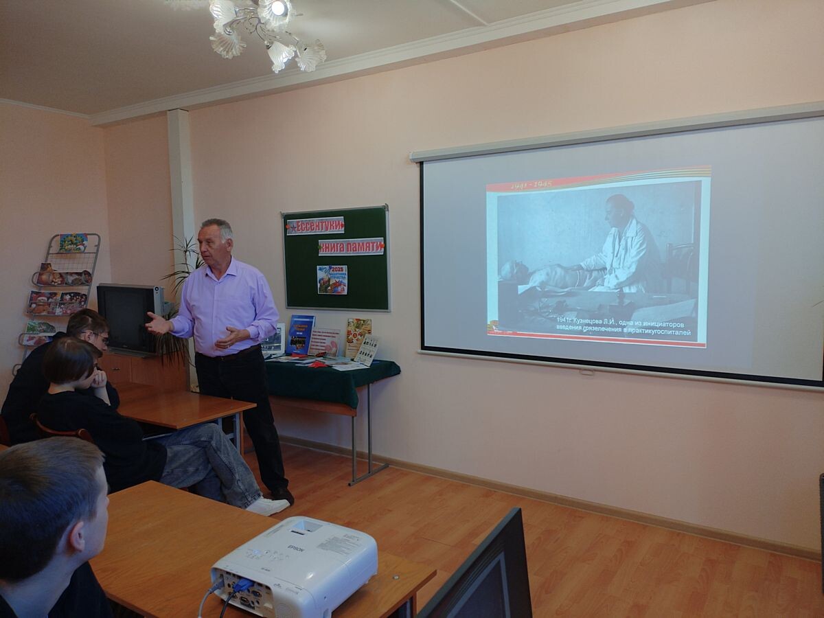 15 января 2025 года сотрудниками Центральной городской библиотеки совместно с ГБПОУ «Ессентукским центром реабилитации инвалидов и лиц с ограниченными возможностями здоровья» для воспитанников Центра был проведён патриотический урок «Война в судьбе моего города», посвященный 82-ой годовщине освобождения города Ессентуки от немецких захватчиков. В ходе мероприятия учащиеся вместе с ведущей – библиотекарем ЦГБ, члена Совета ветеранов города Ессентуки, Шипулиной Ириной Александровной, вспомнили главные исторические шаги на пути к победе в Великой Отечественной войне. Молодые люди услышали рассказ о тяготах военного времени в период оккупации города Ессентуки, узнали о подвиге медиков, спасавших жизни советских солдат в госпиталях города, об ушедших и живых героях той войны. Актуальным и содержательным был рассказ о подвигах земляков – ессентучан, внёсших свой вклад в разгром немецких захватчиков и ставших за свои подвиги Героями Советского Союза. Коняев Олег Николаевич – сотрудник библиот