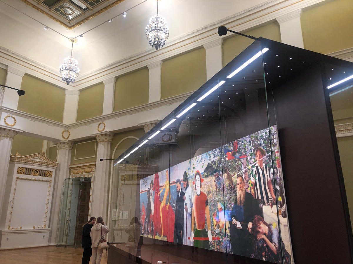 Авторы выставки постарались связать её с историей Центрального павильона. Здесь представлены работы советских художников 1920-60-х годов (часть из них так или иначе связана с ВДНХ) и коллажи из 2000-х. При этом на стенах павильона выставочные полотна не вешали. Для них приготовили огромные стеклянные витрины, расположив из в залах так, чтобы они не мешали осматривать восстановленные интерьеры. Жалко только, что стёкла в витринах с вертикальными швами/стыками, что здорово мешало фотографировать. Кроме картин выставлены скульптуры из фондов Третьяковки, но о них (и о самом павильоне) я рассказала в предыдущей статье.