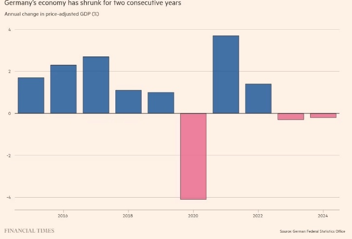 Крупнейшая экономика Европы сократилась на 0,2% в 2024 году В 2024 году экономика Германии сократилась второй год подряд, что свидетельствует о серьёзности экономического спада в стране. Федеральное статистическое управление сообщило, что в прошлом году экономика крупнейшей европейской страны сократилась на 0,2%, после снижения на 0,3% в 2023 году. Экономисты ожидали, что снижение составит 0,2%. «Германия переживает самый продолжительный период стагнации за всю свою послевоенную историю», — отметил Тимо Вольмерсхойзер, экономист Ifo, аналитического центра в Мюнхене. Он также добавил, что страна демонстрирует значительно более низкие показатели по сравнению с другими странами. Это подтверждение того, что Германия переживает один из самых затяжных экономических кризисов за последние десятилетия, пришло за шесть недель до проведения внеочередных выборов. В ходе предвыборной кампании активно обсуждались темы деиндустриализации, разрушения инфраструктуры и вопроса о том, следует ли стране о