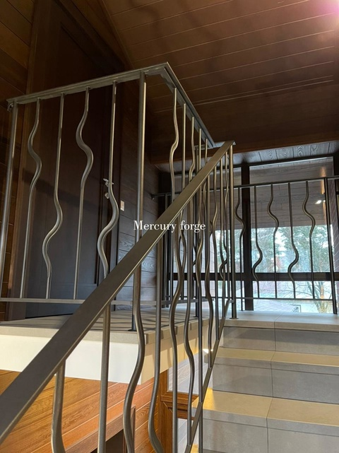 Коллекция Ronde - одна из самых популярных коллекций ограждений из ассортимента французской фабрики Grande forge. Этa коллекция состоит из кованых стальных стоек и столбов в современном и классическом стиле. Элементы этой коллекции отличаются плавными гармоничными формами и высоким качеством изготовления. Часть элементов отливается из стали, а другие куются с помощью гигантского молота. Изюминкой коллекции является серия изогнутых стоек с помощью которых можно создавать замысловатые узоры ограждений имитирующих волну или круги на воде. При создании комбинаций ограждений стальные стойки и столбы могут крепиться разными способами. Например крепления стоек и столбов, они в начале крепятся к монтажной полосе или квадрату, а затем созданные секции ограждений монтируются к лестнице. При другом способе каждая стойка или столб крепится в ступень по отдельности. При этом монтажное отверстие в ступени закрывается декоративным основанием квадратной формы. Стальной поручень является классическим
