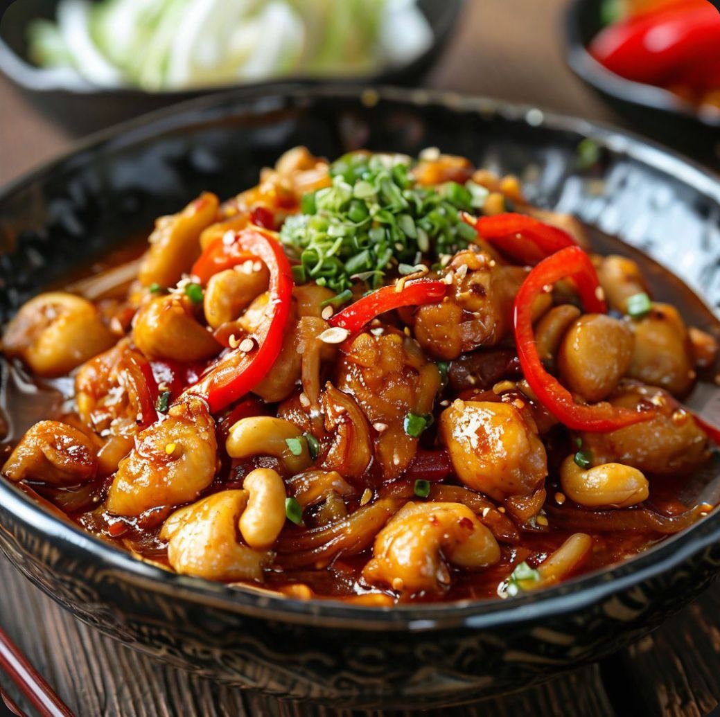 Гун Бао Цзы — это классика китайской кухни, любимая как местными жителями, так и туристами. Блюдо отличается богатым вкусом и ярким сочетанием остроты, сладости и солености, а также хрустящей текстурой орехов кешью. Его основой является куриное мясо, которое готовится с орехами, сушеными чили и ароматными специями. --- Часть 1: Подготовка ингредиентов Основные ингредиенты: Куриное филе — 400 г Орехи кешью — 100 г Сушеный красный чили — 5–6 стручков (или по вкусу) Болгарский перец — 1 шт. Лук — 1 шт. Чеснок — 3 зубчика Имбирь — 1 ч. ложка (натёртый) Соевый соус — 3 ст. ложки Рисовый уксус — 1 ст. ложка Кукурузный крахмал — 1 ч. ложка (для загустения соуса) Сахар — 1 ч. ложка Кунжутное масло — 1 ст. ложка Растительное масло — для жарки Для маринада: Соевый соус — 2 ст. ложки Сахар — 1 ч. ложка Кукурузный крахмал — 1 ч. ложка Для соуса: Соевый соус — 2 ст. ложки Устричный соус — 1 ст. ложка Кунжутное масло — 1 ч. ложка Рисовый уксус — 1 ст. ложка Вода — 50 мл Кукурузный крахмал — 1 ч. лож