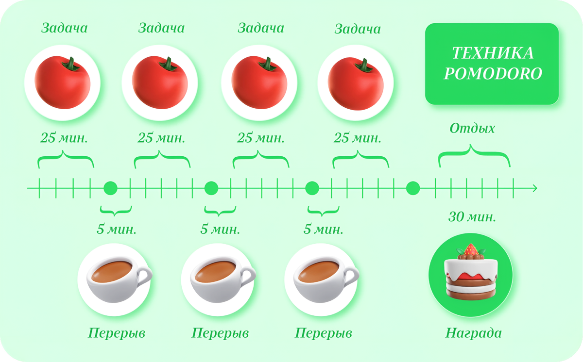Метод Помодоро — это простая и эффективная система управления временем, разработанная Франческо Чирилло в конце 1980-х годов. Название происходит от кухонного таймера в форме помидора, который использовал автор методики. Давайте разберем, как эта техника может повысить вашу продуктивность. 1. Структура одного "помидора": 2. Главные правила метода: 1. Подготовка рабочего пространства: 2. Планирование задач: 3. Процесс работы: Короткие перерывы (5 минут): Длинные перерывы (15-30 минут): 1. Неправильное планирование: 2. Нарушение правил: 3. Психологические ловушки: 1. Настройка интервалов: 2. Выбор инструментов: 3. Интеграция с другими методиками: Краткосрочные: Долгосрочные: 1. Ведение статистики: 2. Создание ритуалов: 3. Работа с окружением: 1. При частых прерываниях: 2. При потере концентрации: 3. При сложности с переключением: P.S. Техника Помодоро — это инструмент, который нужно адаптировать под свои потребности. Не стремитесь к идеальному исполнению