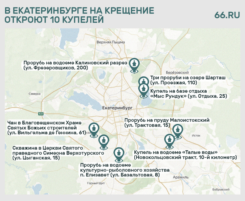 Купели будут работать на следующим адресам: Напомним, что нырять в ледяную воду опасно для здоровья и жизни. Из-за теплой погоды в январе купели откроют не по всей Свердловской области. Например, в Заречном и Краснотурьинске их не будет. Лед на местных водоемах оказался слишком тонкий. В 2025 году на крещенские купания ограничат число людей на льду.