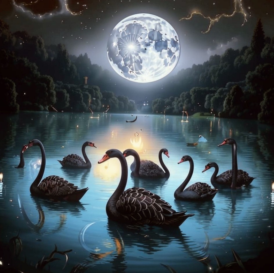 В одном далёком краю, где горы смыкаются с небом, а леса простираются до самого горизонта, пряталось тихое озеро. Вода в нём была такой прозрачной, что можно было разглядеть дно, усеянное сверкающими камушками, будто звёздами, упавшими с небес. На этом озере жили семь чёрных лебедей-принцев. Каждый день они скользили по водной глади, оставляя за собой серебристый след, который медленно растворялся в зеркальной поверхности воды. Их широкие и мощные крылья рассекали воздух, словно мечи, разрезающие тонкую ткань. Но не только своей красотой славились эти птицы - их сердца были наполнены любовью и глубокой преданностью друг к другу. Они всегда держались рядом, оберегая и поддерживая своих братьев. Но однажды, когда лето уступило место осени, и листья начали опадать, устилая землю золотистым ковром, лебеди ощутили, что наступил момент перемен. Озеро, которое они так нежно любили, вдруг показалось им слишком тесным для их мощных крыльев. Они осознали, что пора покидать родные берега и отпра