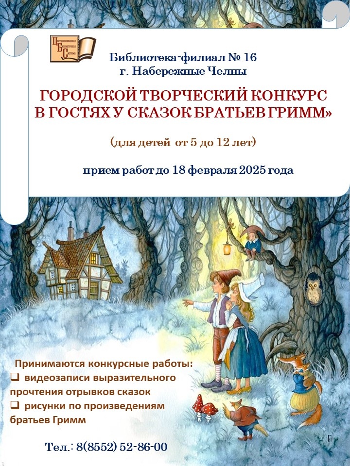 С 13 января по 18 февраля 2025 года МБУ «Централизованная библиотечная система» приглашает детей от 5 до 12 лет принять участие в городском творческом конкурсе «В гостях у сказок братьев Гримм».