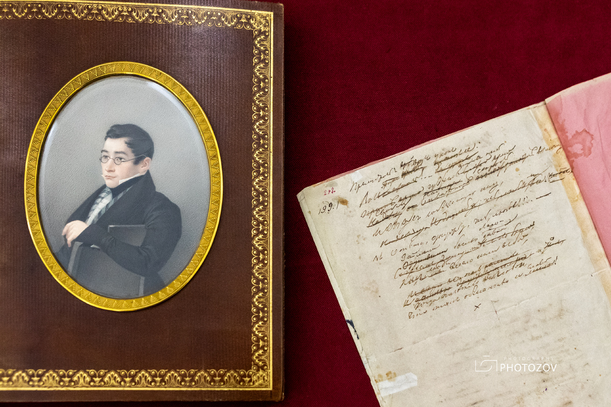 Одними из ценнейших экспонатов стали подлинный черновой автограф стихотворения поэта «Прости, отечество!» и авторизованная писарская копия «Горя от ума» с дарственной надписью Грибоедова издателю Фаддею Булгарину: «Горе мое поручаю Булгарину. Верный друг Грибоедов. 5 июня 1828».