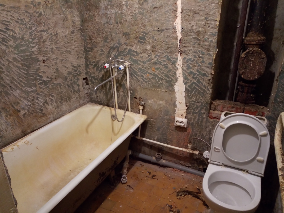 Чтобы было представление о ванной комнате, в которой делался ремонт, вот как она выглядела после снятия старой плитки. Сначала был перепаян водопровод. Частично трубы убраны в штробу. Далее в местах оставшейся краски были сделаны насечки. Ну и загрунтованы стены. Грунт использовался глубокого проникновения. По лазерному уровню выставлены маяки на гипсовую штукатурку. Для выставления плоскостей будущих стен маяки на смежные стены приклеивались под 90 градусов. Как вариант можно сделать и так: Сначала выставлены на две противоположные стены, на одинаковом расстоянии друг от друга. А после оштукатуривания стен, с учетом угла 90 градусов выставлены маяки на две другие стены. Ниша и окно были закрыты гипсокартоном. В нише также был проложен (не мной) кабель для стиральной машины. Далее с помощью правила стены были оштукатурены. Залит наливной пол. И еще. Поскольку счетчик был за унитазом, т.е. в не самом удобном месте, он был перенесен выше. Планка для смесителя заштукатуривалась с учетом т