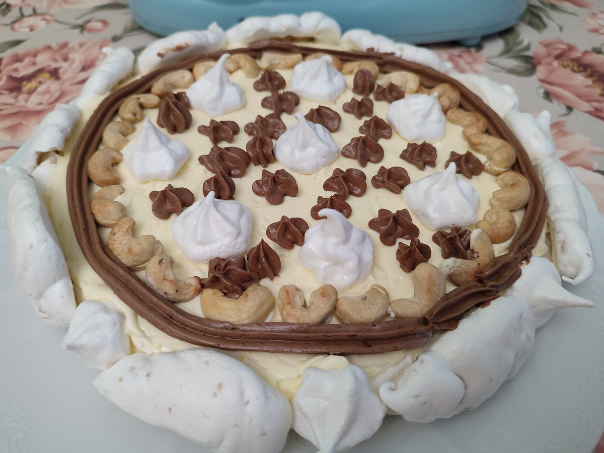 Смазать кремом верхнюю часть и бока торта. Украсить меренгой, кремом другого цвета и орешками.