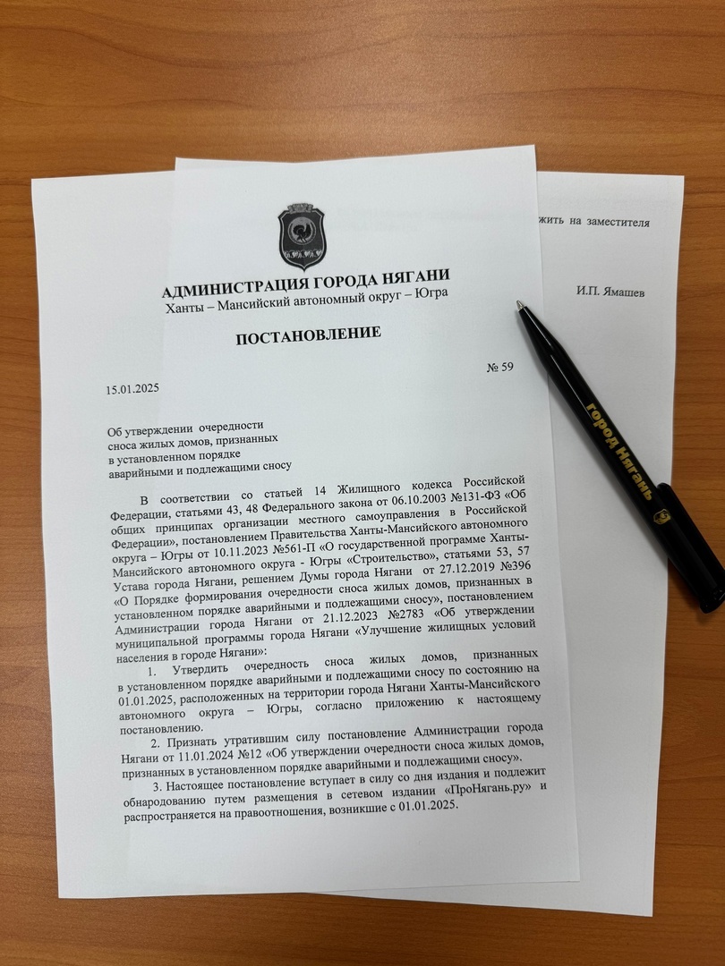 Глава Нягани Иван Ямашев сегодня подписал Постановление Администрации города Нягани «Об утверждении очередности сноса жилых домов, признанных в установленном порядке аварийными и подлежащими сносу». Утверждена очередность сноса жилых домов, признанных в установленном порядке аварийными и подлежащими сносу по состоянию на 01.01.2025 года, расположенных на территории города Нягани. Всего в списке 215 аварийных многоквартирных жилых домов общей площадью 126,4 тыс. кв.м., в которых проживает 2 401 семья, 6 812 человек. Как сообщил глава Нягани, в 2025 году в соответствии с утвержденной новой адресной программой планируются к расселению первые 18 аварийных многоквартирных жилых домов из указанной очередности.