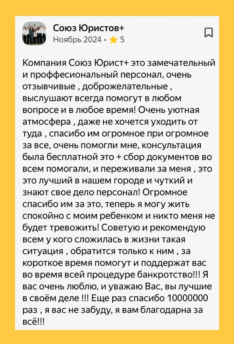 1. Проверьте: как долго компания на рынке и зарегистрирована ли она официально ❗️ Компания «Союз Юристов+» была официально зарегистрирована 9 августа 2018 года. То есть уже более 6 лет мы помогаем гражданам законно списывать долги по кредитам и займам. Все наши гарантии прописаны в договоре. 2. Официальная оплата услуг Мы принимаем только официальную оплату своих услуг, все данные о нас есть в налоговой. Оплатить услуги можно у нас в офисе, а также по реквизитам. Все чеки об оплате мы отправляем клиентам. 3. Отзывы клиентов компании Мы заботимся о наших клиентах, поэтому после завершения процедуры их теплые отзывы - наши главная награда 🥇 На наших площадках уже более 800 отзывов клиентов и уже более сотни живых видео отзывов 🎥 Хотите бесплатно проконсультироваться с юристом - пишите https://t.me/menegerSU ❤️