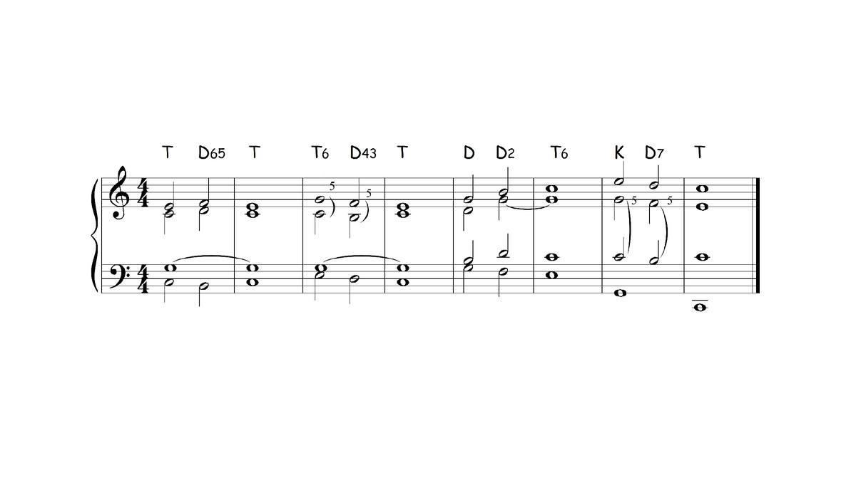 Немного занимательной гармонии. Если самые распространённые гармонические обороты с обращениями доминантового септа расположить по порядку, начиная со вспомогательного оборота с квинтсекстом (65, 43, 2, 7), то получится маленькая пьеса в духе хорала.
