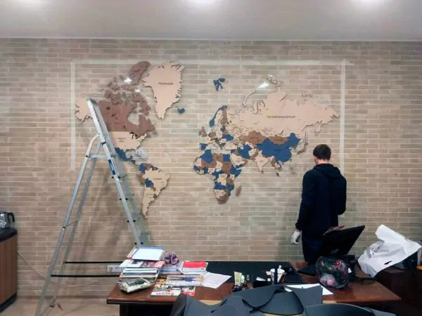 Хотите купить деревянную карту на стену для себя или в подарок, но не уверены, что сможете установить ее самостоятельно? В этой статье вы найдете пошаговую инструкцию по монтажу карт на стену и полезные советы по этой теме для покупателей. Перед началом работ по установке карты подготовьтесь и проверьте, что у вас есть все необходимое. Чтобы не забыть ничего важного, пройдитесь по нашему чек-листу. Чтобы установить деревянную карту надежно и правильно, следуйте инструкции из этого раздела по шагам. Если вы будете точно следовать алгоритму, все обязательно получится! 1. Зафиксируйте основания держателей. На подложке каждого фрагмента карты из акрилового стекла предусмотрены специальные отверстия. Прочно закрепите в эти отверстия основания держателей, которые входят в комплект поставки. Перед установкой фрагментов карты на стену еще раз проверьте, чтобы все держатели закреплены надежно. 2. Прикрепите бумажную схему. Для простоты разметки производители деревянных карт, включая «Крафт-Бюро