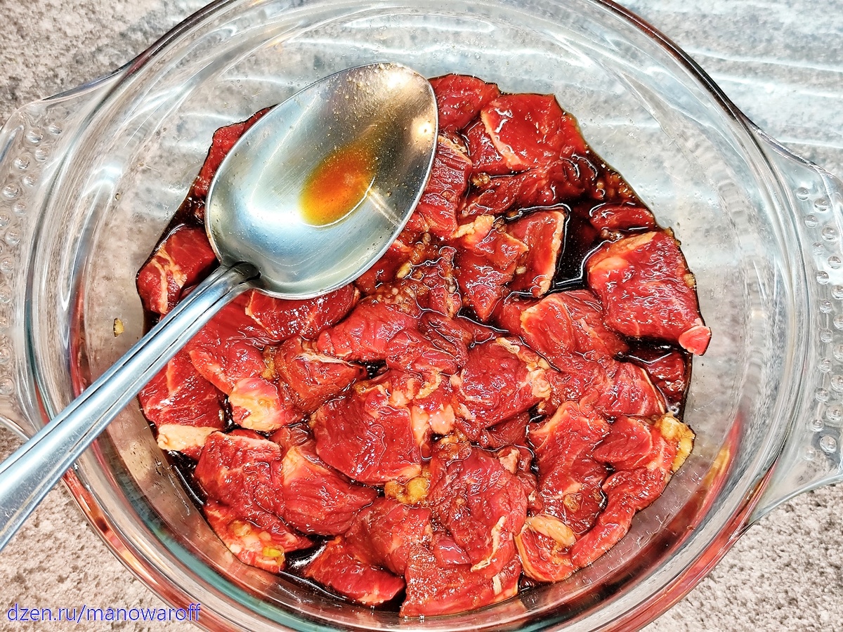 Сегодня у нас, можно сказать, ПП-шный супчик, относящийся к повседневным блюдам корейской домашней кухни. Готовится быстро, за полчаса. Среди ингредиентов есть парочка экзотических, но, как я говорил ранее, все это можно без проблем купить на маркетплейсах. Ингредиенты для супа: Ингредиенты для маринования мяса: Говядину нарезаем небольшими кусочками, складываем в миску, выдавливаем туда чеснок, заливаем кулинарное вино и соевый соус. Хорошенько перемешиваем. Отставляем в сторону мариноваться, а сами пока займемся нарезкой всего остального. Пекинскую капусту разрезаем пополам вдоль кочана. Половину убираем для использования в каком-нибудь еще блюде. Оставшуюся половину разрезаем еще раз вдоль, а затем нарезаем поперек с интервалом сантиметра в три. Луковицу нарезаем тонкими перьями. Чеснок крошим помельче. Острый перец режем тонкими кольцами вместе с семечками. Тем временем говядина слегка промариновалась, так что в холодную кастрюлю с толстым дном заливаем растительное масло, добавляе