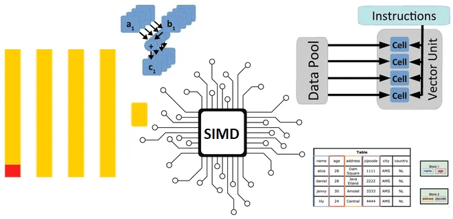 Как мы уже отмечали здесь, ClickHouse имеет встроенную поддержку векторных вычислений, когда при выполнении одной инструкции процессора производится не одна операция, а одновременно несколько однотипных операций над несколькими порциями данных. Процессоры, которые это поддерживают, называются SIMD (Single Instruction, Multiple Data). SIMD-процессоры обеспечивают параллелизм на уровне данных, реализуя множественный поток данных на одиночный поток команд. Короткие SIMD-инструкции (64 или 128 бит) появились в процессорах общего назначения в 1990-х годах благодаря введению специальных регистров с повышенной разрядностью и команд для работы с ними. Векторные инструкции реализуют те же операции, что и скалярные, но имеют более высокую производительность благодаря обработке большего объема данных. Современные процессоры позволяют обрабатывать данные в векторах с использованием SIMD-инструкций с помощью ручной или автоматической векторизации компилятором.