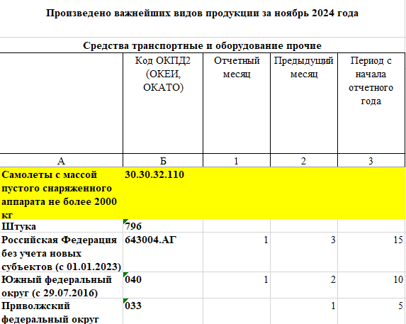 Двенадцать месяцев назад мы подводили итоги российской авиационной жизни 2023 года. Обстоятельно, с цифрами, фактами и выводами. С фотографиями. Перечитывая тот материал, появляется ощущение, что второй раз то же самое делать не нужно - потому что за год мало что изменилось. Прежде чем перейти к оценкам, давайте посмотрим на сухие цифры. Они публикуются Росстатом (Федеральная служба государственной статистики РФ) ежемесячно и вы с ними можете ознакомиться всегда в первоисточнике. Итак, давайте поглядим - чего и сколько в России сделано по авиационной теме. В штуках и килограммах (незасекреченных Минобороны). В начале января 2025 года доступны данные за периоды: 11.2024/10.2024/итого в 2024 (без декабря). И вот смотрите скриншоты из таблички. Там понятно всё. Произведено 15 легких самолётов. Это, видимо, всё частная авиация. Далее: Ещё 3 самолёта. Потяжелее. Навскидку даже не скажу, что это за тип у нас такой делают. Вряд ли Ан-2. И пара больших бортов. Это, наверное, в статистику попа