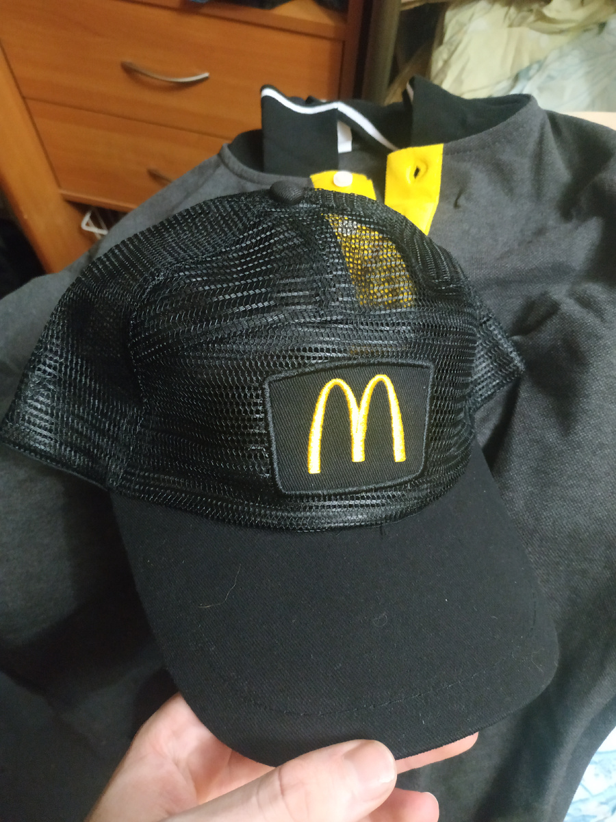 Важный момент: нашивка нужна была, чтобы закрыть старый логотип Макдоналдса. На дворе был ноябрь 2022 года, и с момента ребрендинга прошло всего немного времени. Компания решила не выкидывать старую форму, а использовать её с минимальными изменениями. Это решение, хоть и практичное, выглядело немного забавно.