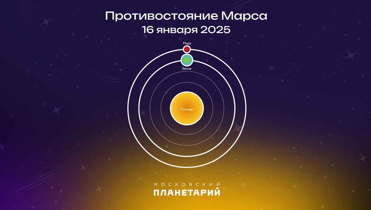Высоко над южным горизонтом в полночь сияет яркаякрасноватая «звезда» – это планета Марс. Сейчас его блеск равен -1,4m! 16 января 2025 года в 6:00 мск, находясь в 96,3млн км от Земли, он вступит в противостояние с Солнцем. Противостоянием астрономы называют такое расположение небесных тел, когда на одной линии расположились Солнце, Земля и планета (от Марса до Нептуна). Такая ситуация и произойдет 16 января 2025 года, на одной линии окажутся Солнце, Земля и Марс, Земля посередине, а Марс противостоит Солнцу. Противостояния Марса происходят примерно через каждые два года (в среднем через 780 суток). Во время противостояний Марс имеет максимальный блеск, пересекает небесный меридиан в полночь и заходит с восходом Солнца, т.е. виден всю ночь. В период противостояния, когда Марс приближается к Земле, видимый диаметр планеты увеличивается в 4 или даже в 5 раз (например, в 2020 году с 4,5 угловых секунды в январе до 22,5 угловые секунды в октябре) и его поверхность удобнее всего изучать в