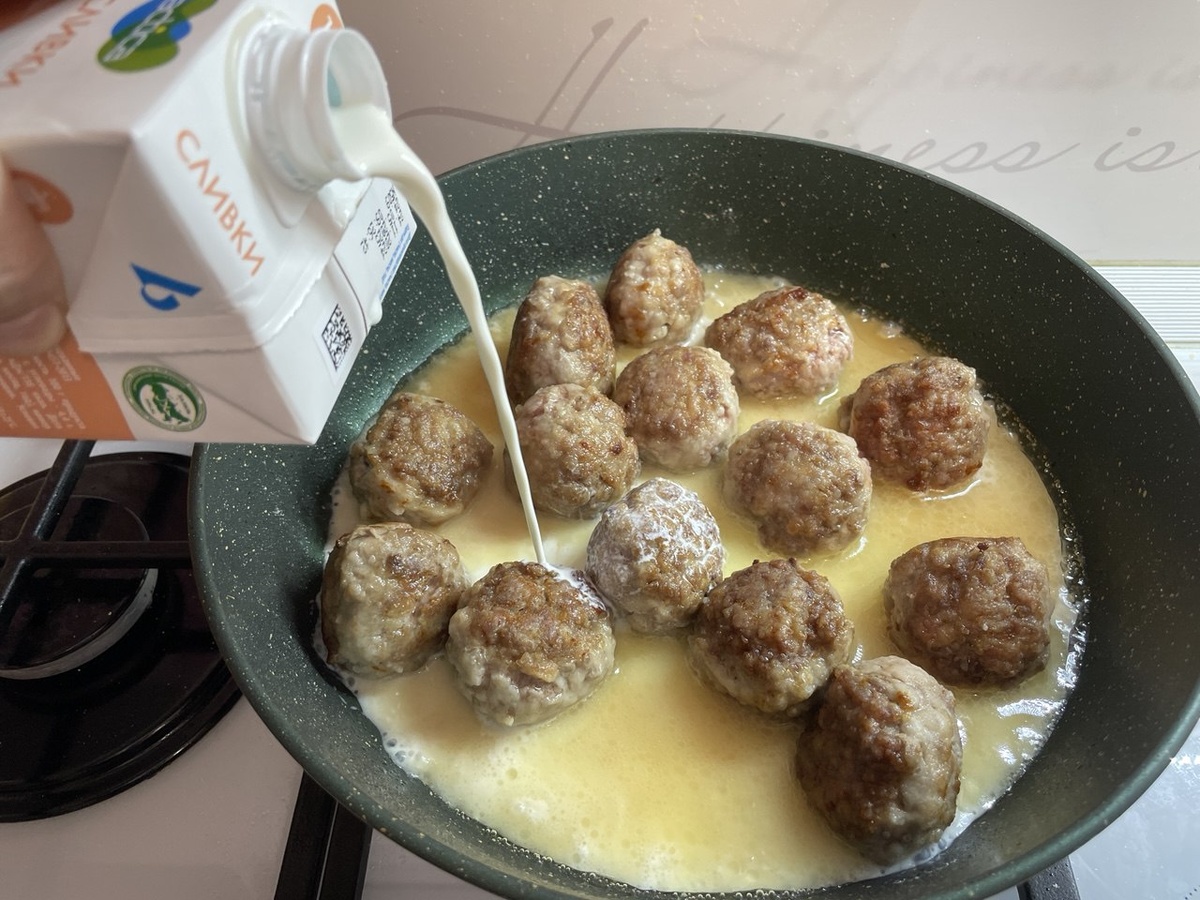 У нас очередной рецепт из серии очень быстрых ужинов. Если есть в холодильнике фарш, то это всегда спасение, а если нет, то его всегда можно купить по пути домой. Нам понадобится: В фарш для этого блюда добавляю только соль и черный молотый перец, все хорошо вымешиваю. Из подготовленного фарша слепить небольшие тефтельки и обвалять их в муке. В сковороде с разогретым маслом обжарить сформированные тефтельки со всех сторон до румяного состояния. Затем влить сливки и тушить на медленном огне минут 15. За это время вы успеете приготовить практически любой гарнир - макароны, рис, гречку. У нас сегодня гречка. Здорово такой ужин дополнит овощной салат. А у вас что на ужин?))