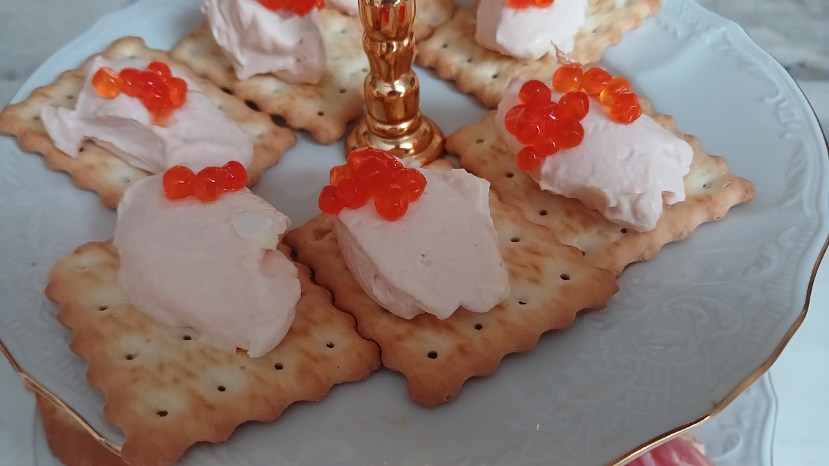 Для подачи я использовала крекеры. Можно подать в тарталетках (так я тоже подавала). Сверху можно украсить зернышками икры.
