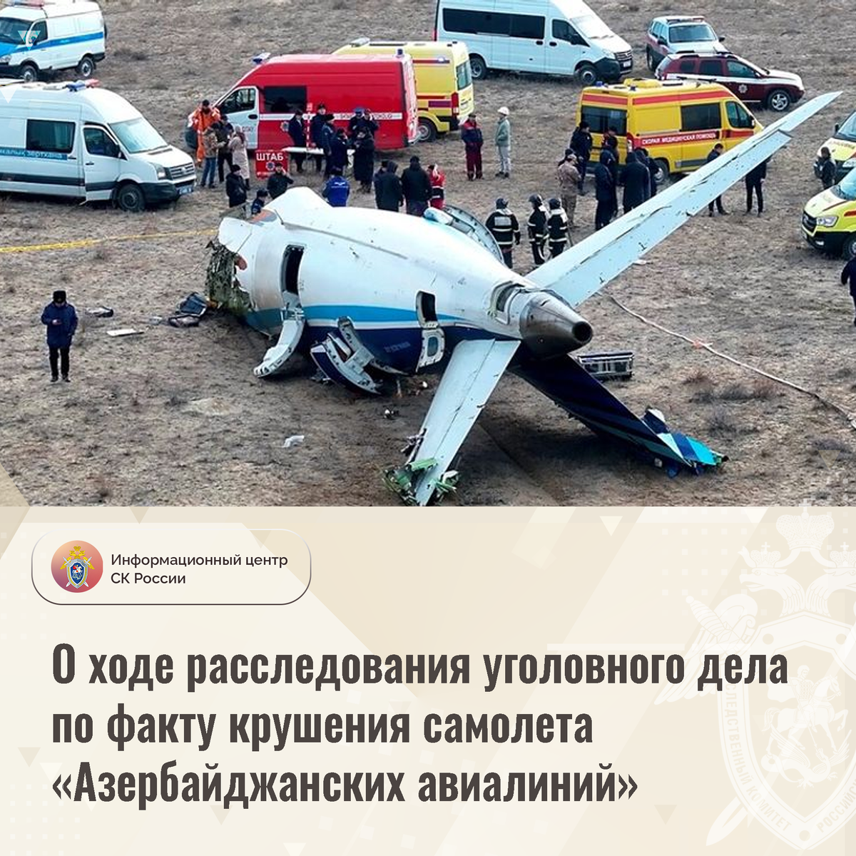 О ходе расследования уголовного дела по факту крушения самолета «Азербайджанских авиалиний» Следственный комитет России продолжает расследование уголовного дела о крушении 25.12.2024 года на территории Республики Казахстан самолета Embraer-E190 авиакомпании «Азербайджанские авиалинии», повлекшем гибель 39 человек и причинение вреда здоровью 28 человек (ст.263 УК РФ). Следствием налажено взаимодействие с компетентными органами Азербайджанской Республики и Республики Казахстан. Во взаимодействии со специалистами Межгосударственного авиационного комитета изучаются полученные в Бразильском центре расследования и предотвращения авиационных происшествий (SENIPA) данные с самописцев воздушного судна. Анализируются переговоры диспетчеров Грозного, Махачкалы и Минеральных Вод с командиром воздушного судна. Назначена комплексная авиационно-техническая экспертиза. Изучается состояние всех систем воздушного судна, а также вещественные доказательства. Для оценки действий должностных лиц диспетчерск