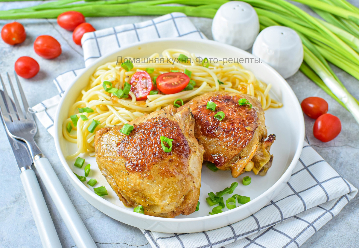 Когда совсем не хватает фантазии на приготовление, то можно приготовить курочку. Просто каждый раз делаем разный маринад. Вот и сегодня на ужин куриные бедра и спагетти. Чтобы не получилось всухомятку - делаем к курочке немного подливы. Ингредиенты: Для начала приготовим к курочке маринад. Налейте в чашу соус Терияки и растительное масло. Добавьте соль и специи. Смешайте. Куриные бедра полностью обмажьте получившимся маринадом и оставьте постоять на 1-2 часа. Курочка успеет промариноваться. Для жарки налейте на горячую сковороду немного растительного масла и выложите куриные бедра. Обжарьте их с двух сторон до подрумянивания. Затем сделайте огонь меньше. Отдельно очистите лук и ополосните его в холодной воде. Мелко нарежьте. Затем добавьте в сковороду к курице. От лука появится характерный аромат. Обжарьте его 1-2 минуты. Затем подлейте в сковороду горячую воду и накройте крышкой. Тушите курицу на небольшом огне 20-25 минут. Периодически бедра переворачивайте для равномерного приготов