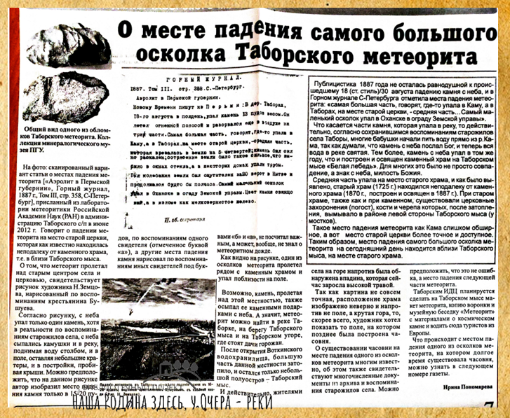 Читаем И. Пономарева О месте падения самого большого осколка Таборского метеорита// Оханская сторона . - 2012.- 28 сентября.