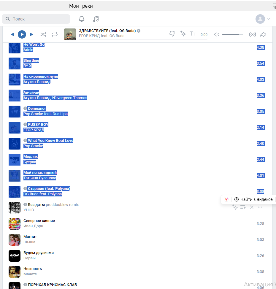 - Перейдите на страницу необходимого плейлиста во ВКонтакте и выделите полностью текст с названиями и именами исполнителей.