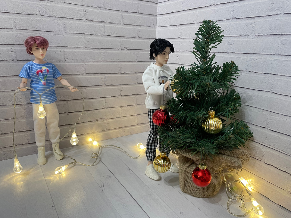 Вот и позади длинные зимние праздники. Немного жаль расставаться с ёлочкой и всей новогодней красотой. Но теперь мы дружно ждём весну) Ну а пока можно вспомнить, как в кукольном домике праздновали Новый Год) С самого раннего утра в доме была суета - в гости к Тэхёну и Чонгуку должны придти их хёны - Юнги и Чимин. Дел полно, но как говорится «конь еще не валялся». Надо украсить комнату и ёлку нарядить. -Тэхёни-хён, ты у нас за красоту и эстетику отвечаешь, поэтому наряжай ёлку. А я буду за освещение. У Тэхёна с ёлкой сложилось как-то быстрее, и он конечно помог младшему в борьбе с гирляндой. Общими усилиями гирлянда была побеждена. Но расслабляться рано! Не хватает стола и стульев. -Чонгуки, комнату к приходу гостей мы подготовили. А вот о еде не подумали. Может доставку закажем? -Ни в коем случае! Разве там вкусно накормят? Я сам все приготовлю! Тэхёни-хён, ты отдыхай, а я за дело! -Посмотри, какая красота! И аромат какой! Доставка тебя так не накормит! Спустя много часов… -Всё готово