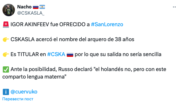 Первоисточник слуха о возможном переезде Акинфеева в Аргентину – не очень популярный аккаунт @SanLorencismo_. У парня много ярких твитов: он называет главу «Сан-Лоренсо» Марсело Моретти «сыном тысячи шлюх» и угрожает сделать суицид, если клуб подпишет вратаря Гомеса. Вот такой источник отправил Акинфеева в Аргентину.