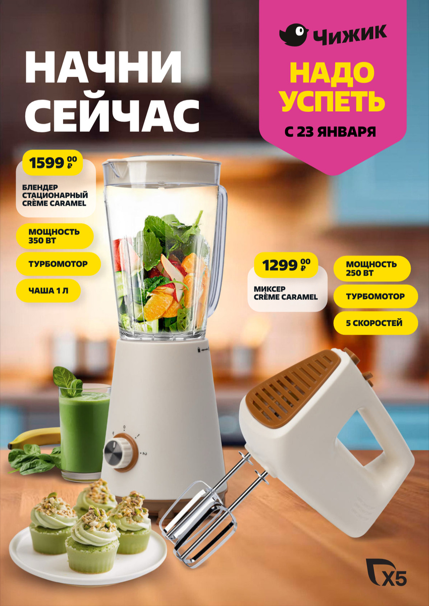 Всем привет-привет, дорогие подписчики и читатели!❤️ Не успели мы оглянуться, как на горизонте уже замаячил новый каталог от магазина Чижик! А ведь многие из вас ещё даже не успели до конца изучить все новинки, которые были представлены ранее. Так, что в этой статье ознакомимся с предстоящим ассортиментом, что ожидается на полочках, уже на следующей неделе с 23 января! Ну, а кто не видел актуальный обзор всех новинок из Чижика на этой неделе, то ознакомится можно тут 👇 Изображения на канале не являются рекламой, а лишь информирует аудиторию об акциях, скидках и ценах в магазинах. Все, что я пишу и говорю в социальных сетях, это мое оценочное суждение. Как всегда пишу на бегу, в другой магазин, чтобы скорей поделиться с Вами свежими обзорами, могут быть ошибки в статье, так, что ценители русского языка не судите строго. Какая сочная и яркая обложка с новинками - делаю вывод, что на следующей неделе, привезут мелкую бытовую технику для кухни 😁 Тут представлен ручной миксер за 1