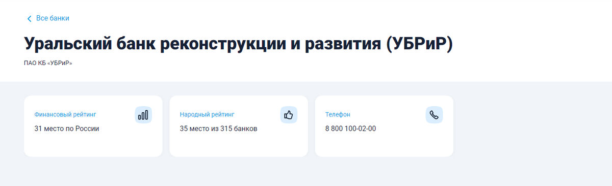 Немного информации об Уральском банке реконструкции и развития. Как видно из скрина с сайта Банки.ру - Публичное акционерное общество «Уральский банк реконструкции и развития» (ПАО КБ «УБРиР») — российский банк из Свердловской области, головной офис расположен в Екатеринбурге, занимает 31 место в финансовом рейтинге банков.