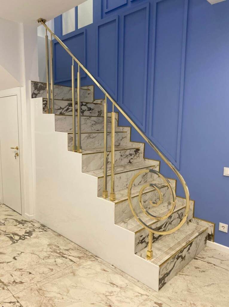 Латунь - это сплав, который состоит приблизительно на 70% из меди и на 30% из цинка. Лестничные перила из этого материала имеют массу достоинств. Основное из них заключается в их безупречных эстетических характеристиках. Они могут добавить роскоши и изысканности любому пространству. Латунь имеет желтоватый оттенок, поэтому визуально напоминает золото. Благодаря этому сходству ее часто используют при оформлении дорогих и изысканных интерьеров. Еще одна причина популярности латунных перил заключается в их удивительной долговечности. Сплав меди и цинка отличается высокой износостойкостью. Это делает его идеальным материалом для изготовления как внутренних, так и внешних конструкций. Перила из латуни - оптимальный выбор для уличных лестниц, поскольку они отлично выдерживают неблагоприятные погодные условия, в том числе перепады температур и воздействие влаги. Благодаря высокой прочности латунь устойчива к механическим нагрузкам. Перила из этого материала не подвержены сколам, трещинам и д