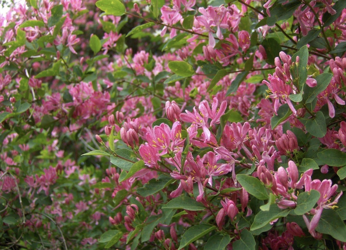 Жимолость татарская очень эффектна во время цветения в мае-июне, когда на кустарнике появляется обилие розовых цветков.