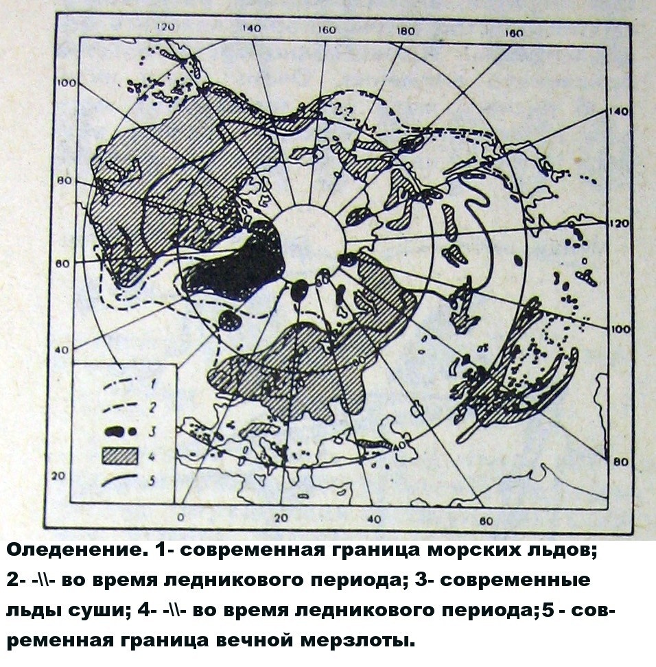 Масштабы оледенения на схеме (Схема взята из статьи Р. Баландина “Следы ледовых катастроф” “Наука и жизнь”, №5, 1982 г. с. 120-125) сильно приуменьшены. Подо льдом была вся Сибирь, что очевидно по современной границе вечной мерзлоты. Центром оледенения была Гренландия. Балтийское море образовалось в результате прогиба земной коры под весом многокилометрового ледника (!). То же самое, скорее всего, относится и к Западносибирской низменности. На этом месте в доледниковый период были горы (!). Северная Америка пострадала от оледенения не меньше, чем Евразия. Она почти полностью была покрыта льдом. По схеме очевидно, что во время оледенения тёплое течение Гольфстрим не огибало Скандинавский полуостров.