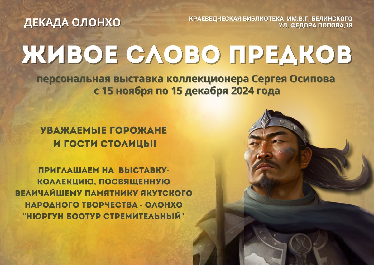 Моя выставка-коллекция, посвященная величайшему памятнику якутского народного творчества - олонхо "Нюргун Боотур Стремительный" 📚 Коллекция «Нюргун Боотур — Живое Слово Предков» была собрана Сергеем Осиповым, уроженцем Ытык-Кюель Таттинского улуса. Сейчас он живёт и работает в Якутске. Коллекция посвящена Нюргун Боотуру Стремительному — герою якутского эпоса Олонхо. Книги о Нюргун Боотуре переведены на многие языки и знакомят с якутской культурой, традициями и мифологией. В коллекции есть книги, музыкальные произведения и сувениры. Сергей отмечает, что первые книги были найдены у родственников, включая экземпляр, подаренный главой Таттинского района в честь юбилея дедушки. В коллекции есть русские и якутские версии книг, в том числе версия Анатолия Ольхона 2024 года и Штейнберга 1960 года. Также есть якутская версия юбилейного года с подарочным шубером и английская версия, найденная на аукционе. Есть детские книги с яркими картинками и цитатами. В коллекции также есть сувениры: ёлочны
