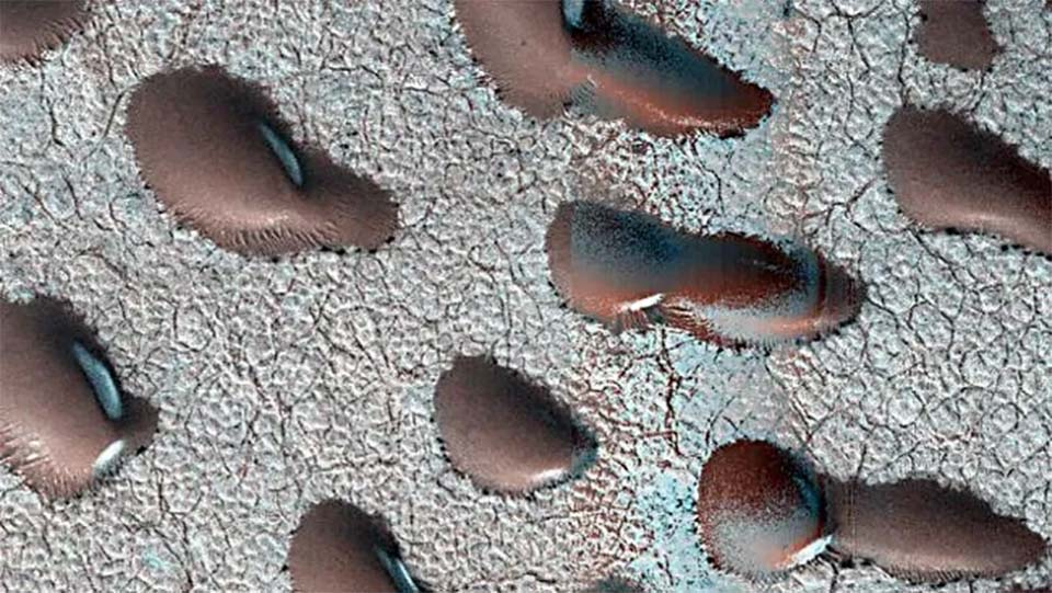 Эти марсианские «фасолины» на самом деле замерзшие песчаные дюны в северном полушарии Марса. Недавно опубликованное фото, сделанное аппаратом NASA Mars Reconnaissance Orbiter (MRO), показывает вид сверху на замерзшие бобовые двойники, сделанный для того, чтобы помочь ученым определить, могли ли условия на Красной планете поддерживать жизнь давным-давно.