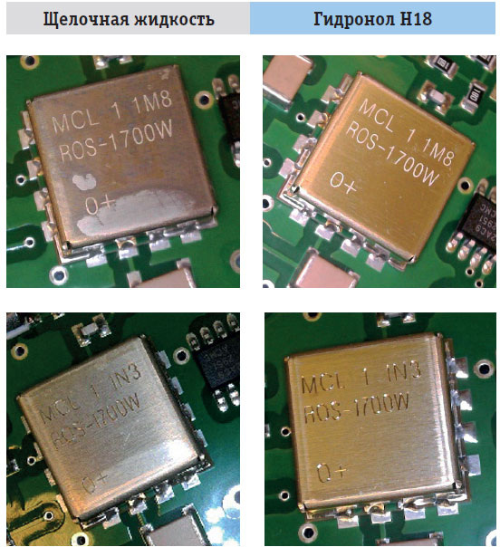 Рис. 2. Совместимость Гидронола Н18 и другой отечественной рН-нейтральной отмывочной жидкости с маркировкой компонентов и печатного узла