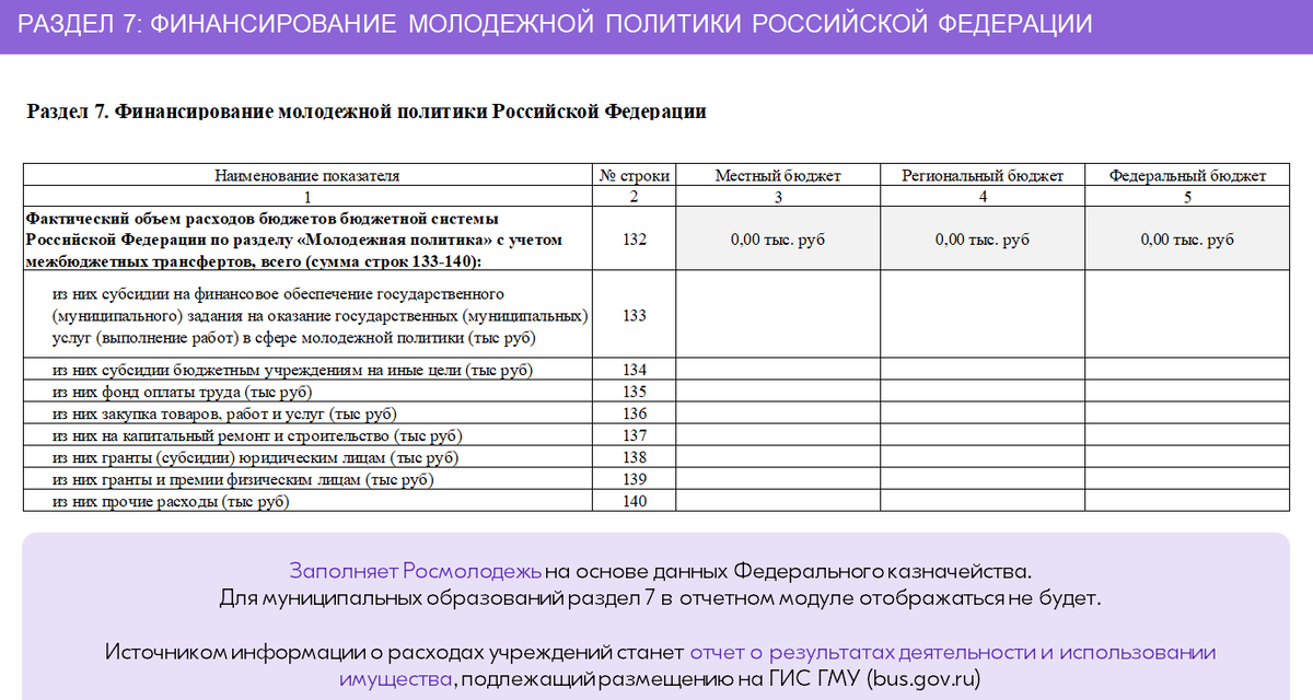 Раздел 7 включает данные о расходовании бюджетных средств, выделенных по разделу «Молодежная политика» за отчетный финансовый год. Информацию в раздел 7 вносит Росмолодежь на основании данных Федерального казначейства Российской Федерации. Объем бюджетных средств, указываемый в графах 3, 4, 5 (по строкам 133–140, должен включать все расходы по разделу «Молодежная политика», в том числе межбюджетные трансферты. В строке 133 отображается объем бюджетных средств субсидий на финансовое обеспечение государственных (муниципальных) заданий на оказание государственных (муниципальных) услуг (выполнение работ) в соответствии с соглашениями, заключенными между учреждениями и органом власти. В строке 134 отображается объем бюджетных средств субсидий бюджетным и автономным учреждениям на иные цели в соответствии с соглашениями, заключенными между учреждениями и органами власти. В строке 135 отображается объем средств на оплату труда штатных работников с учетом доплат и надбавок компенсационного хар