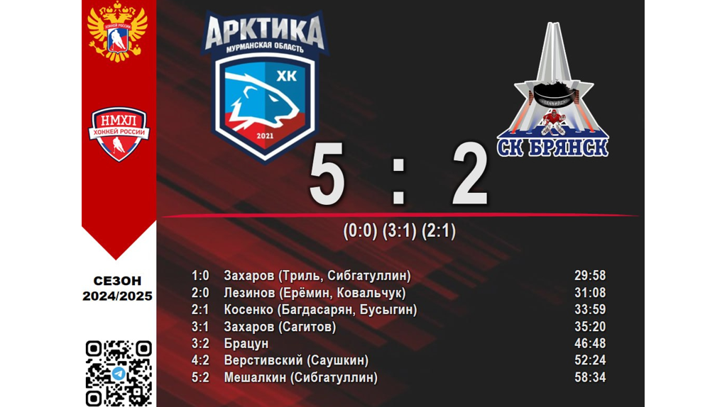 В НМХЛ возобновилось регулярное первенство. Брянская команда стартовала в новом году в гостях в Мурманске. В первом матче с мурманской «Арктикой» гости сумели навязать борьбу крепкому середняку турнирной таблицы. В первом периоде обе команды сохранили свои ворота в неприкосновенности. Счет был открыт лишь в середине матча. Отличились мурманчане. Через минуту они удвоили преимущество. В тяжелой и вязкой борьбе гости из Брянска смогли размочить счёт. Точным броском отметился Михей Косенко, которому ассистировали Георгий Багдасарян и Михаил Бусыгин. На второй перерыв команды ушли со счётом 3:1 в пользу мурманчан. А на 47-й минуте встречи Владимир Брацун сократил отставание ХК «Брянск» до минимума - 3:2. Концовку встречи лучше провели хозяева. У «Арктики» хватило сил после новогодних каникул, чтобы раскатать оборону брянцев и забить еще две шайбы. Матч закончился со счётом 5:2 в пользу «Арктики». Брянцы попытаются извлечь урок из этого поражения. Уже сегодня, 16 января, они проведут повтор