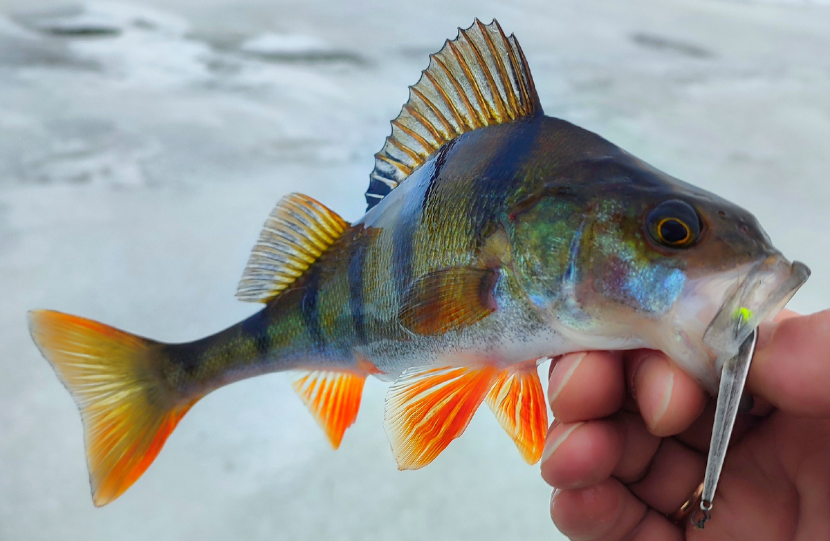 Следующая блесна, которую предложил окуням Финского Залива - это MF Ice "ЛЛЛ" длиной 55мм в подвесном варианте. По размеру она практически равна "Кобоне 7", но более легкая, плавная в работе. На нее, как мне показалось, поклевочки увереннее. И, когда рыбы было не много с лунки, она уговаривала их быстрее.