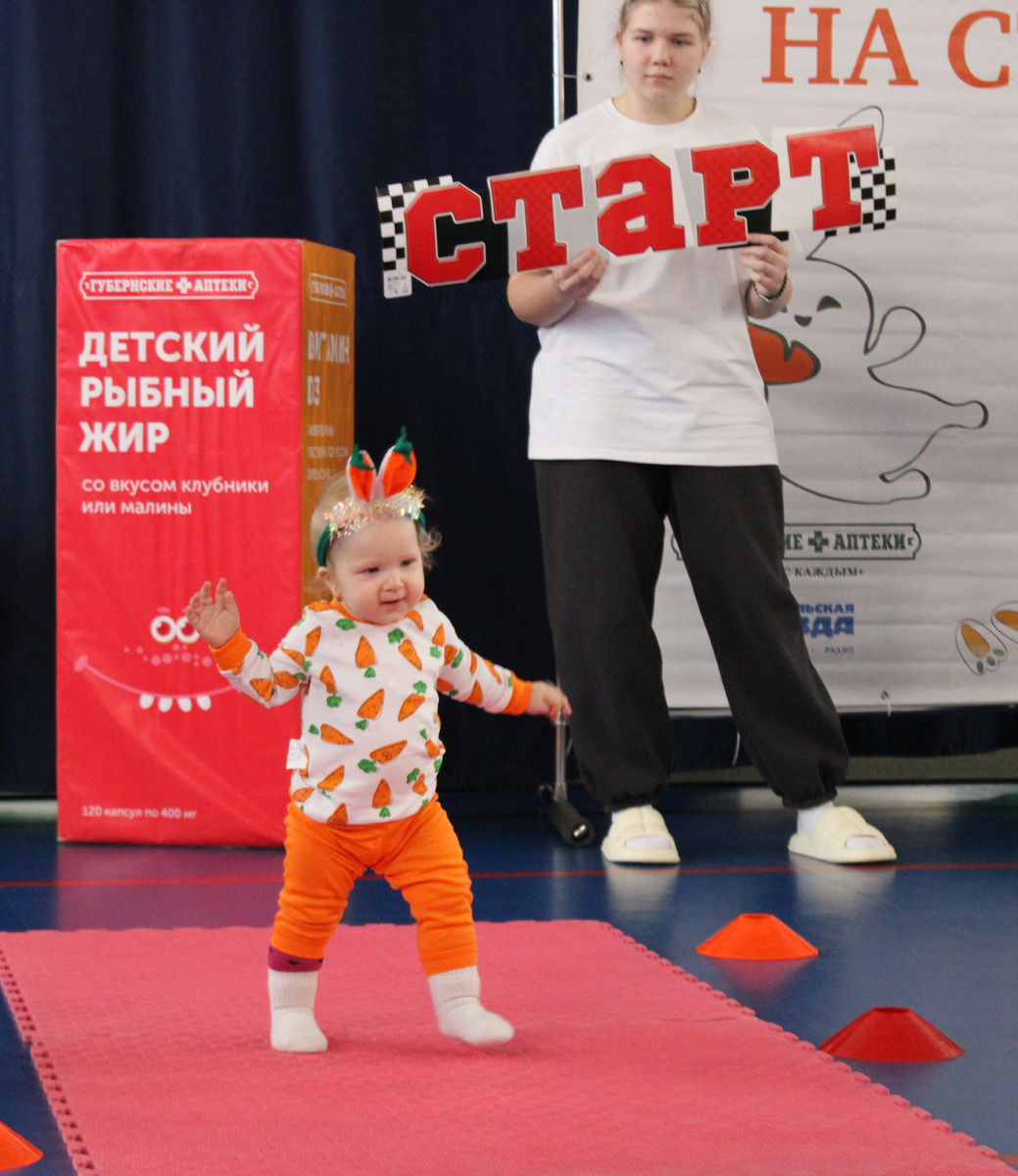 Первыми на дорожки вышли юные спортсмены от 8 месяцев и сразу очаровали присутствующих. Но самое интересное началось после слов «На старт, внимание, марш!». Несмотря на то, что дистанция короткая, для карапузов она оказалась серьезным испытанием. Чем только не приманивали родители своих чад, чтобы вдохновить их ползти вперед: в ход шли любимые игрушки, бутылочки, гаджеты… Время не фиксировалось. Поэтому те малыши, кто дополз или дошел до финиша, однозначно были уже победителями. Там же, на финише крохи получали свои первые медали, подарки от организаторов и, конечно же, овации от болельщиков. Здорово, просто здорово! Семейный праздник завершился дискотекой, и для кого-то такой же первой в жизни!