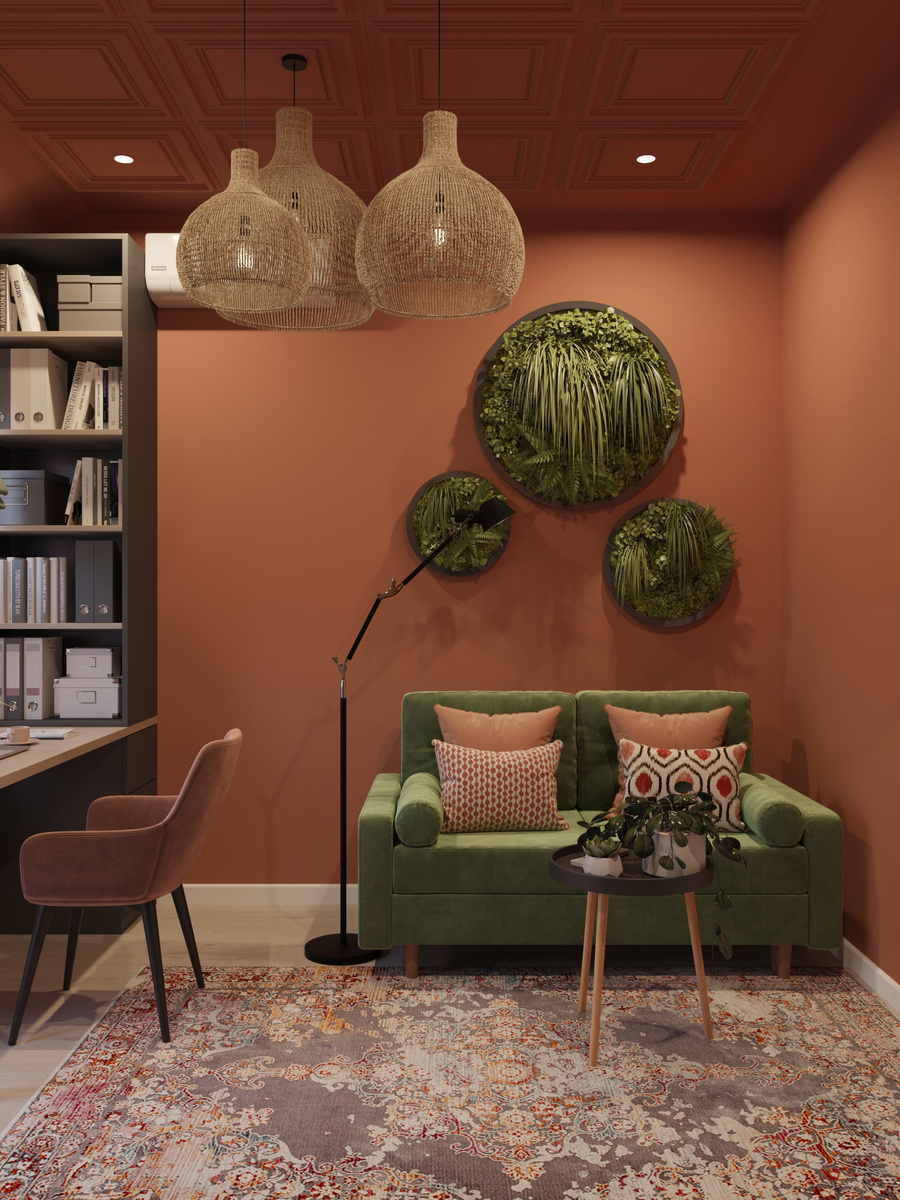 По желанию заказчиков дизайн кабинета должен был отличаться от основного дизайна квартиры, что я и сделала, опираясь на референсы клиентов. Основной цвет в комнате - терракотовый, а дополнительный - зеленый, который отлично сочетается с терракотовым и уже есть в гостиной, тем самым помещения объединяются между собой. Плюс черный цвет встречается во всех комнатах, кроме детской, что также хорошо поддерживает весь интерьер. Кессонированный классический потолок - отголосок к другим комнатам квартиры с многочисленной лепниной.