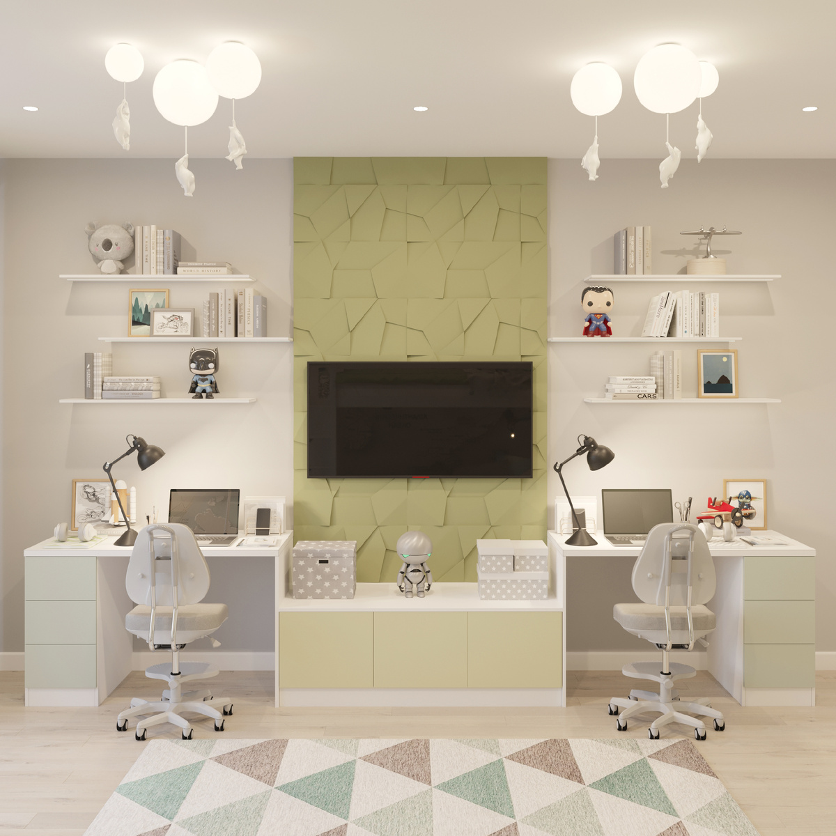 Детская комната рассчитана на долгие годы: можно легко перекрасить стены, заменить фреску и светильники, вместо двухъярусной кровати поставить отдельностоящие. В данном помещение основной цвет - серый, дополнительный - зеленый. Зеленый цвет присутствует во фреске, что отлично перекликается с другими зелёными оттенками в интерьере. Также можно заметить, что этот цвет уже есть в гостиной и кабинете, тем самым помещения объединяются между собой. Как и в других комнатах квартиры, так и в детской есть разные источники света (люстры, точки, бра, подсветка, настольные лампы), что позволяет создавать различные варианты сценарий освещения. Светильники «Медвежата» и качели были привнесены из прошлой квартиры.