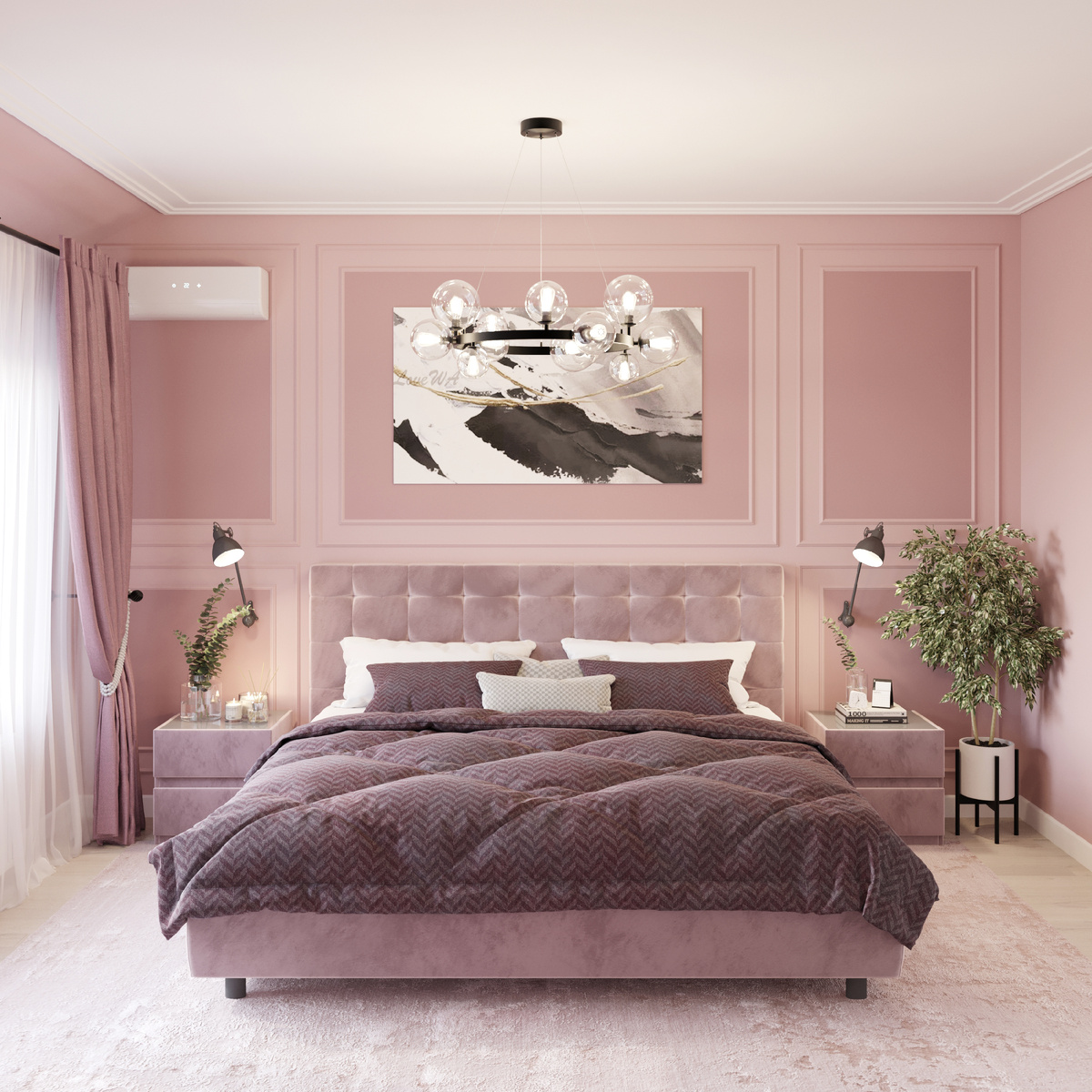 Комната получилась в нюансных розовых оттенках. Для того чтобы интерьер не был слишком девичьим, так как спальня для семейной пары, разбавила его черным цветом, что вносит небольшую брутальность в помещение. Также это работает за счет лофтовых свтильников и экспрессивной абстрактной картины. Простое и в тоже время интересное решение акцентной стены за изголовьем кровати: использование молдингов (как и в некоторых других комнатах квартиры) и покраска стен (где-то в 2 раза темнее основного цвета стен) внутри зоны, обрамленной молдингами.