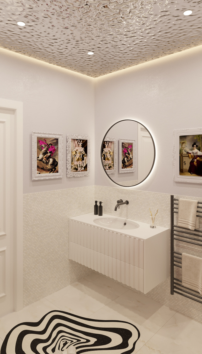 Так как заказчики хотели потолок из нержавеющей стали с фактурой «Рябь на воде», в поддержку водной тематике была добавлена перламутровая мозаика из ракушки. Нестандартной формы и рисунком черно-белый коврик отлично подходит к данной теме. Доминантной в текущем помещении является душевая перегородка с цветным стеклом (эффект - хамелеон), напоминающее закатное небо. В ванной комнате продолжается идея с репликами картин, что делает интерьер необычным и индивидуальным.