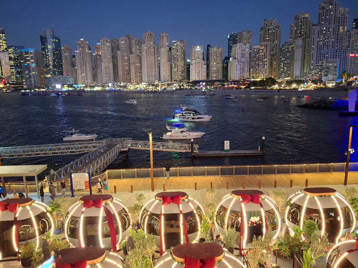Вид с острова Блувотерс на небоскребы Дубая. На острове есть магазины, рестораны. Народу много. Вышли на набережную. Сцена. Колесо обозрения Око Дубая сияет разными цветами. Мы пришли на остров еще и потому, что над морем обещали шоу дронов. Начало в 20 часов и в 22 часа. Мы хотели посмотреть в 20 часов. Пока до шоу было время, решили пойти куда-нибудь поесть. Зашли в "блинбери" :) Такое же заведение есть и в Москве. Станция метро Курская :) Мы блины и взяли! Блины взяли из детского меню. Они чуть меньше обычных, но в два раза дешевле. Взяли блины с курицей и картошкой, с ветчиной и сыром, с клубникой, с вишней. Еще чай, кофе. Поужинали. Сидели на скамеечке, ждали шоу. А его отменили. Был сильный ветер и шоу не состоялось. И пошли мы обратно... Уже с пляжа снимали красивое колесо обозрения. Возвращаемся в отель. Фото по пути. Завтра будет новый день.